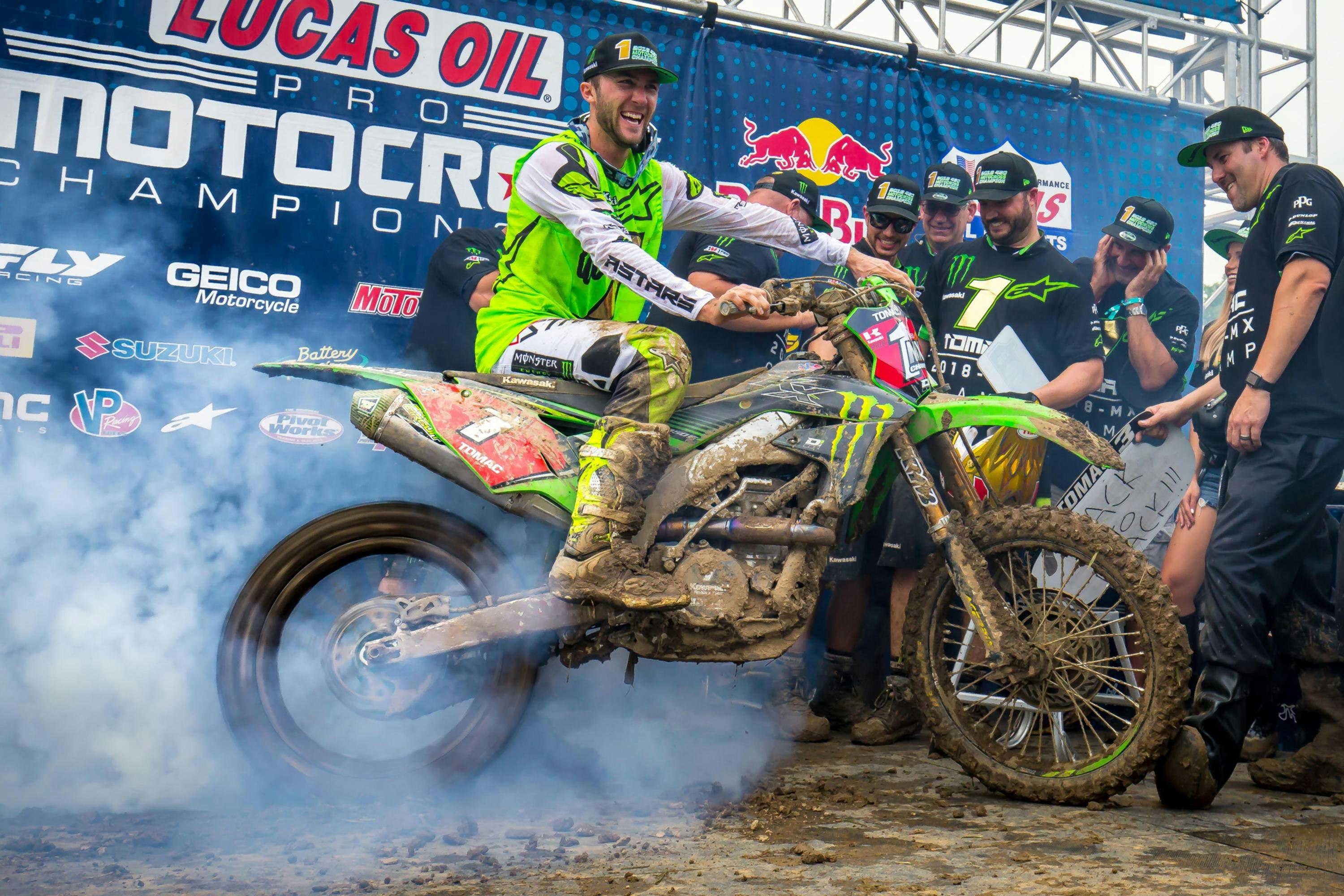 Mother Nature defined the 12th and final round of the 2018 Lucas Oil Pro Motocross Championship, which saw Eli Tomac endure through treacherous conditions to capture his second straight 450 Class title and hoist the Edison Dye Cup for back-to-back seasons. The spoils of victory went to Justin Barcia, who was exceptional in the mud to take his first win since the 2015 season. In the 250 Class, newly crowned champion Aaron Plessinger capped off his final race in the division with a near-perfect performance in which he capped off his breakthrough season with a sixth overall victory.
