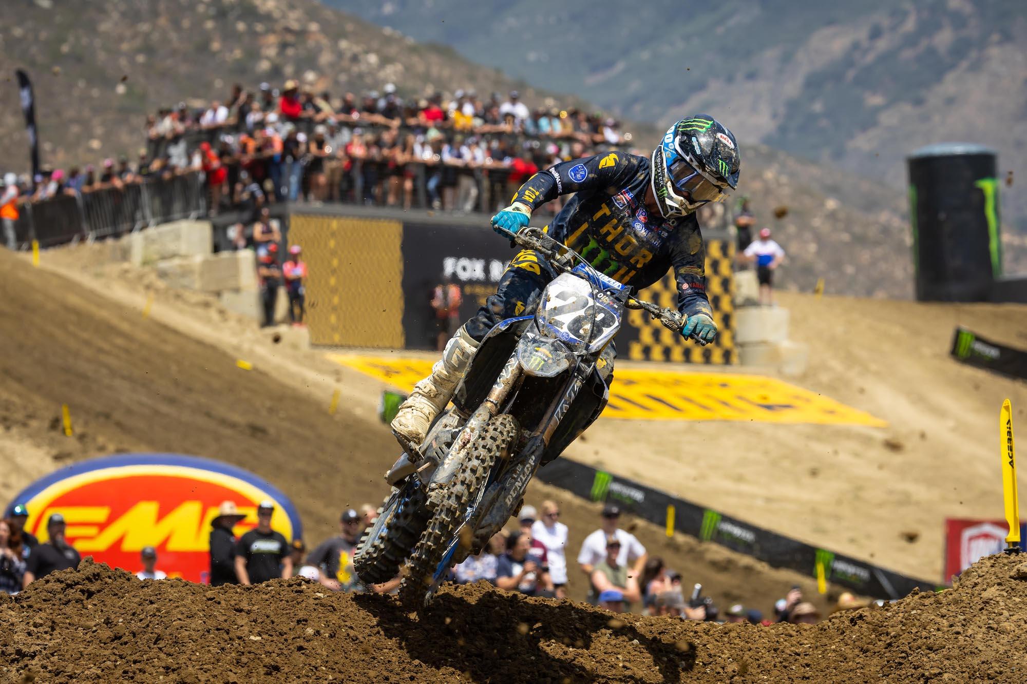 Once out front, Lawrence easily opened a big lead over the field that he maintained through the rest of the moto. Behind him, teammate and brother, Hunter Lawrence, was making moves forward after starting fourth. He made the pass on Hammaker for third and then took over second from Cooper just past the halfway point.