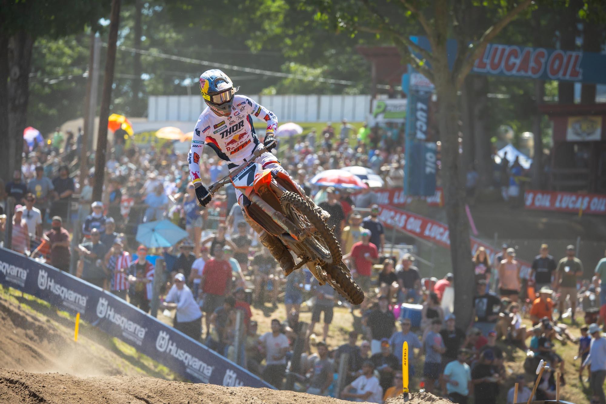 Lawrence closed strong to secure his fifth moto win of the season by 10.8 seconds over Shimoda, while Cooper made the pass back on Hampshire for third. Troy Lee Designs/Red Bull/GASGAS Factory Racing’s Michael Mosiman rounded out the top five, while Hunter Lawrence put in a resilient ride to salvage sixth.