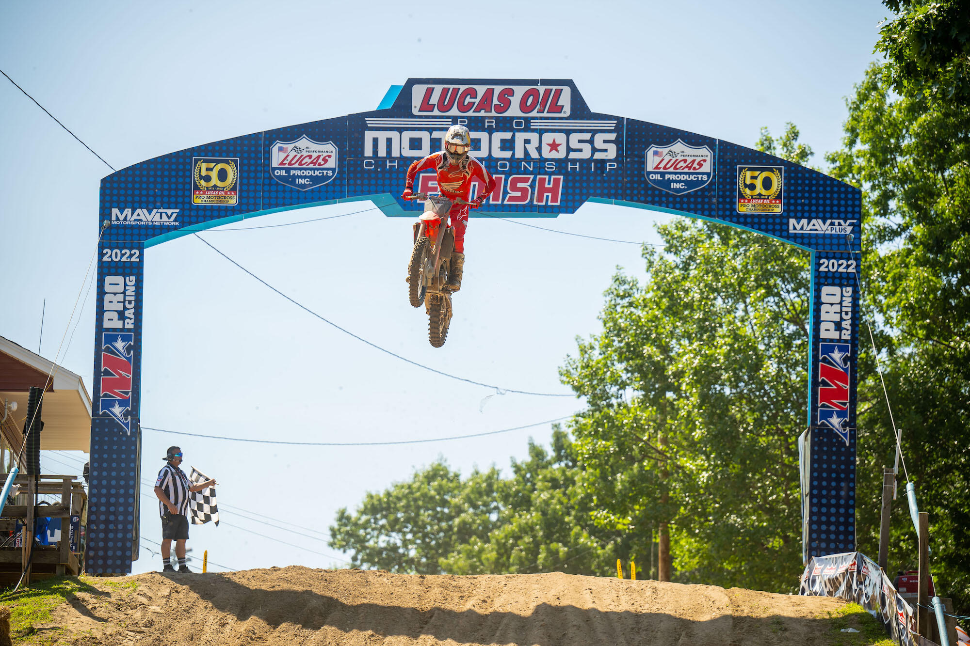 Another picture-perfect afternoon of sunny skies and comfortable temperatures provided ideal racing conditions for Round 6 of the 2022 Lucas Oil Pro Motocross Championship, sanctioned by AMA Pro Racing, as the 50th anniversary season reached its halfway point. The legendary sands of The Wick 338 provided one of the summer’s most unique challenges at the MB Tractor & Equipment Southwick National, where Monster Energy Star Yamaha Racing’s Eli Tomac extended his winning streak to three races with a dominant sweep of the 450 Class motos. In the 250 Class, Team Honda HRC’s Jett Lawrence made his return to the stop step of the podium with an impressive 1-1 performance that resulted in his fifth victory of the season.