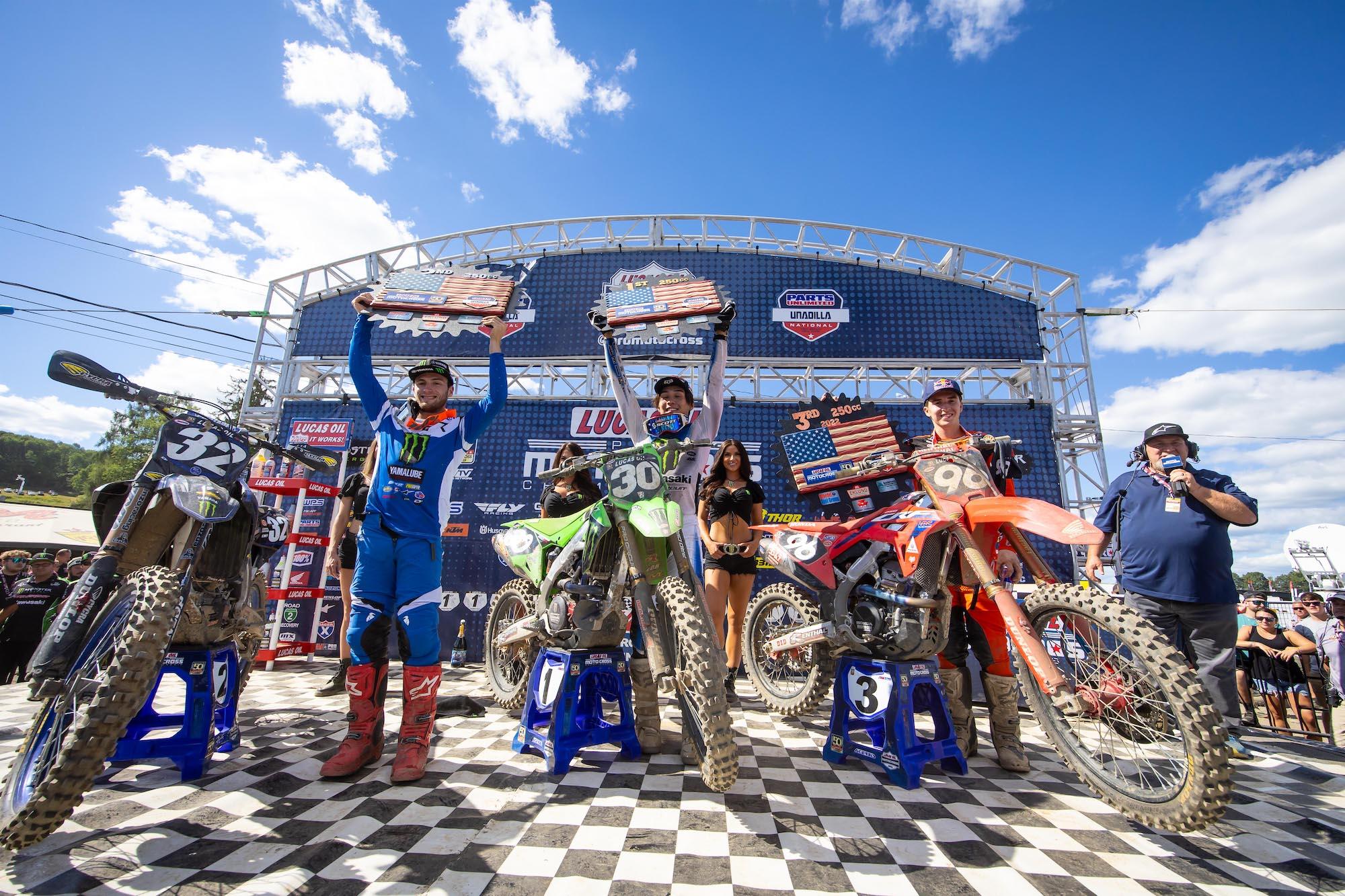 The Lucas Oil Pro Motocross Championship, sanctioned by AMA Pro Racing, kicked off the stretch run of its 50th anniversary season with an annual visit to one of the sport’s most hallowed grounds at Central New York’s Unadilla MX. The Parts Unlimited Unadilla National signified the ninth round of the 2022 season and featured one of the summer’s toughest challenges with a rough and highly technical track, where Team Honda HRC’s Chase Sexton was able to reclaim the lead of the 450 Class point standings with a dominant 1-1 sweep of the motos. In the 250 Class, Monster Energy/Pro Circuit/Kawasaki’s Jo Shimoda prevailed with his second win of the season following a wild day of racing in the smaller displacement.