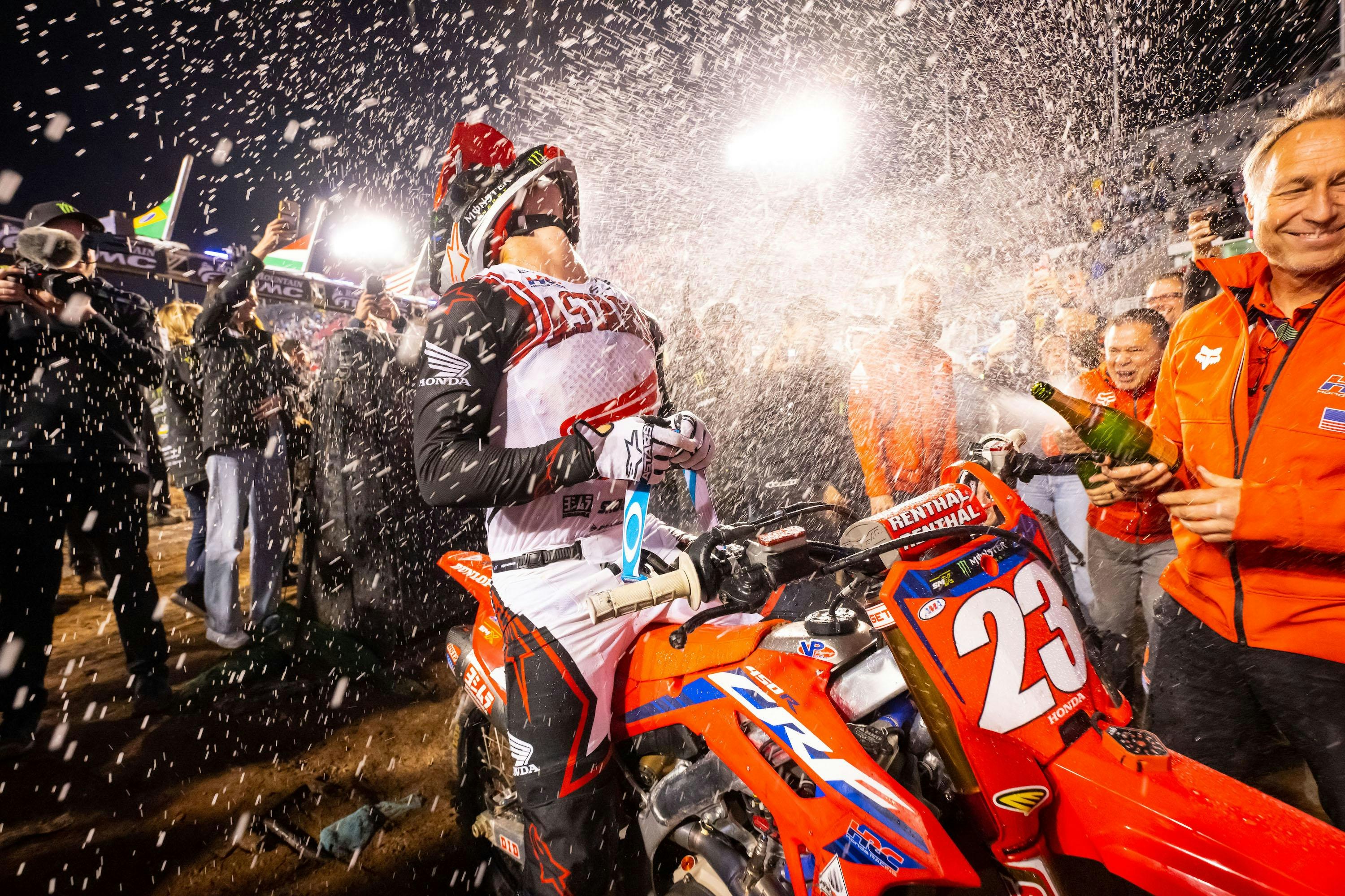 On the podium, the AMA awarded Chase Sexton the Monster Energy Supercross Champion title. He entered the race with the championship mathematically won but received the official #1 plate after the race. With Team Honda HRC's Hunter Lawrence and Jett Lawrence wrapping the two 250SX Class championships at previous rounds, 2023 marked only the third time ever, and second time for Honda, that a manufacturer has captured all three Supercross championships in the same season. The 2023 season marks the 50thAnniversary of Supercross racing in America.
