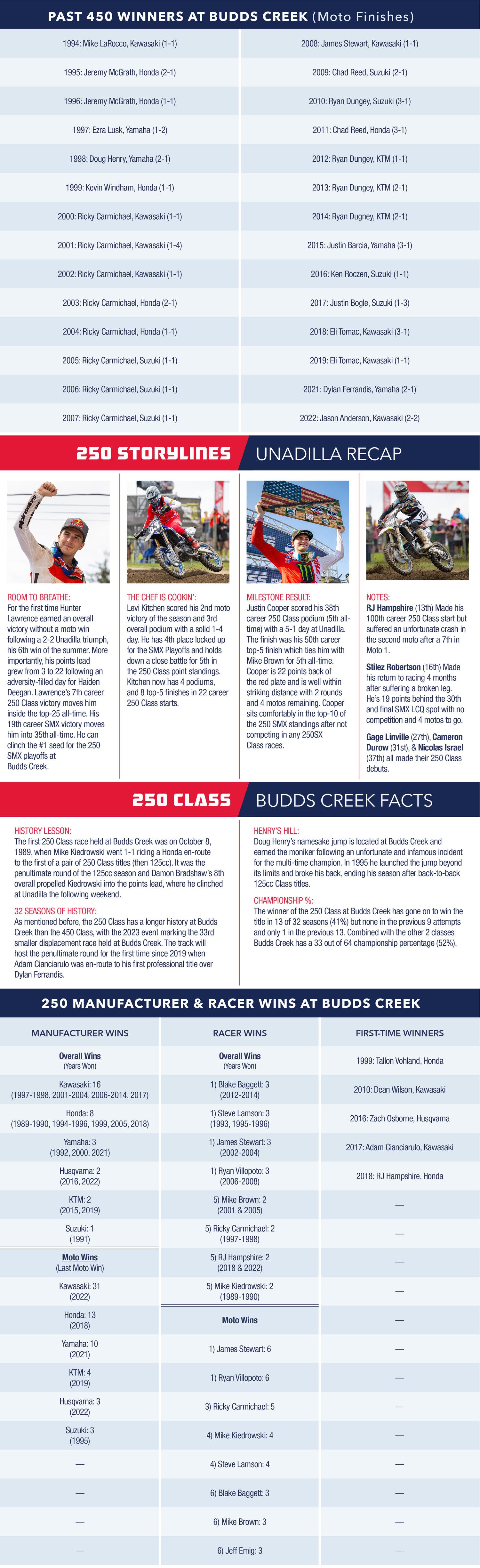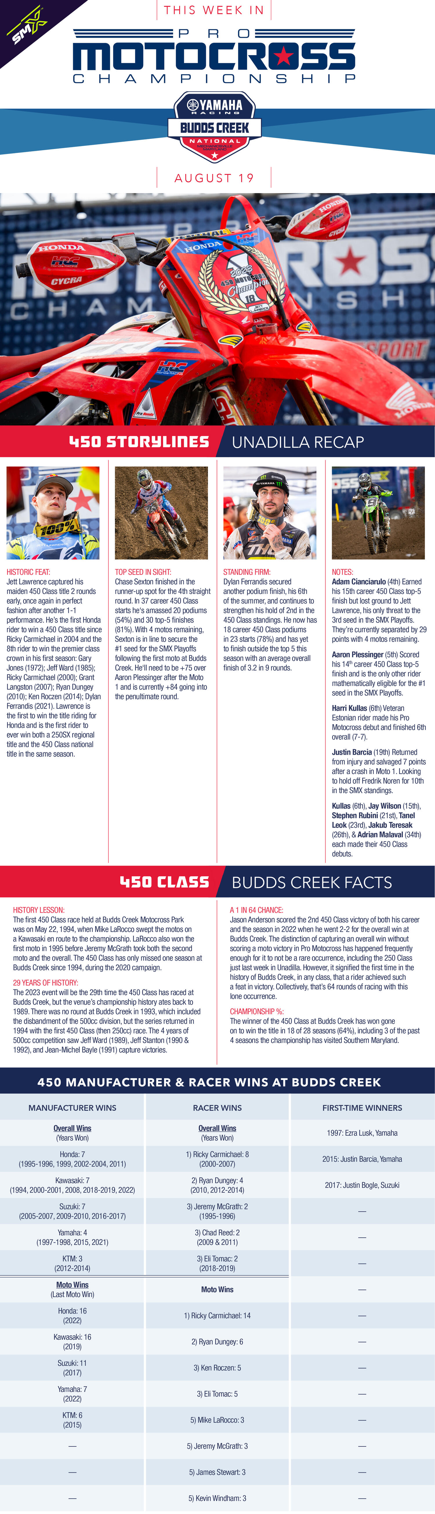 This Week in Pro Motocross: Yamaha Budds Creek NationalThursday, August 17, 2023 | 4:00 PM Home News SuperMotocross This Week in Motocross: 2023 Budds Creek National