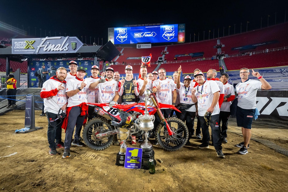 Team Honda HRC's Jett Lawrence won both motos at the SuperMotocross World Championship Finals Fueled by Monster Energy inside Los Angeles Memorial Coliseum. The Australian racer earned the win on the night and the points needed to become the sport's first SuperMotocross World Champion.