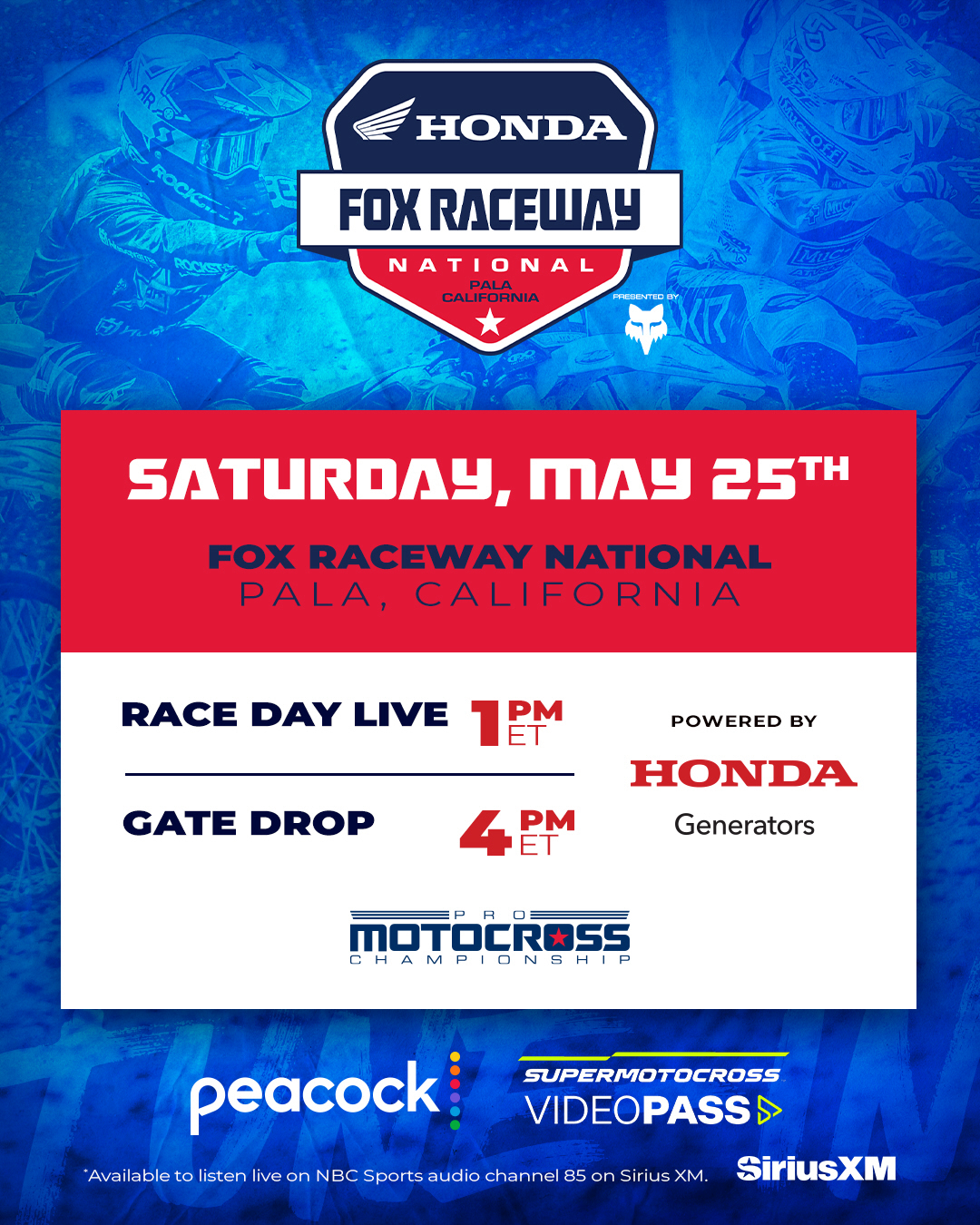 The Honda Fox Raceway National will be broadcast live domestically on Peacock and Internationally on the SuperMotocross VideoPass beginning with Race Day Live at 10 a.m. PT / 1 p.m. ET. Coverage of all four motos of the 250 Class and 450 Class will air at 1 p.m. PT / 4 p.m. ET, followed by the post-race show at the conclusion of the afternoon.