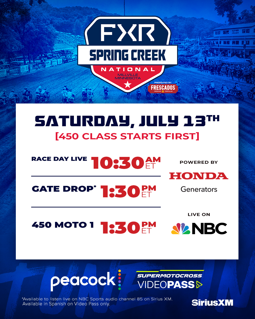 The entire Spring Creek National will be broadcast live domestically on Peacock and Internationally on the SuperMotocross VideoPass beginning with Race Day Live at 7:30 a.m. PT / 10:30 a.m. ET. Coverage of all four motos of the 250 Class and 450 Class will air at 10:30 a.m. PT / 1:30 p.m. ET, followed by the post-race show at the conclusion of the afternoon.