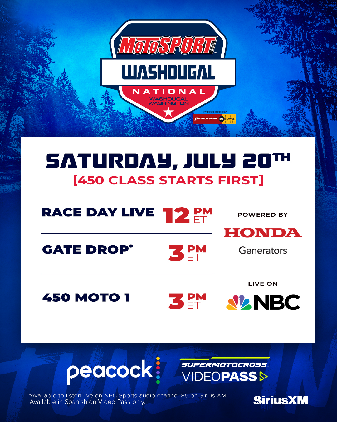 This weekends Washougal National will be broadcast live domestically on Peacock and Internationally on the SuperMotocross VideoPass beginning with Race Day Live at 9 a.m. PT / 12 p.m. ET and coverage of all four motos of the 450 Class and 250 Class airing at 12 a.m. PT / 3 p.m. ET, followed by the post-race show at the conclusion of the afternoon.