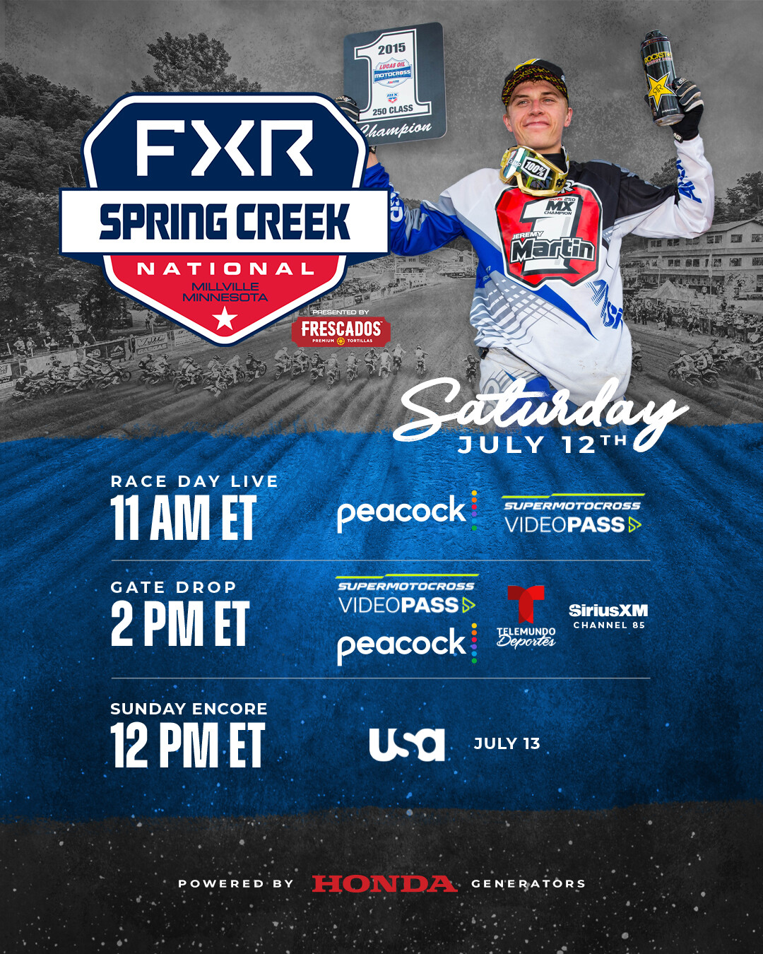 Tune in tomorrow, Saturday, July 12th, starting at 11amET for the FXR Spring Creek National presented by Frescados, round seven of the 2025 Pro Motocross Championship from Millville, MN.